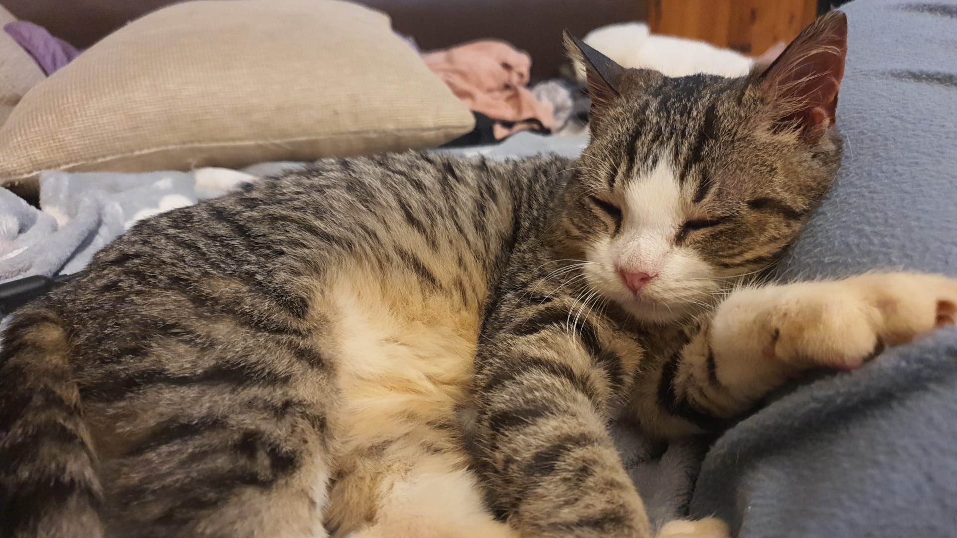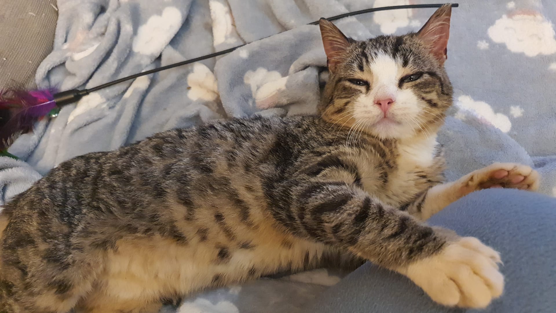 Berlín es un gatito de 3 meses aprox. que fue rescatado hace 2 con mucha congestión y tiña a tope!